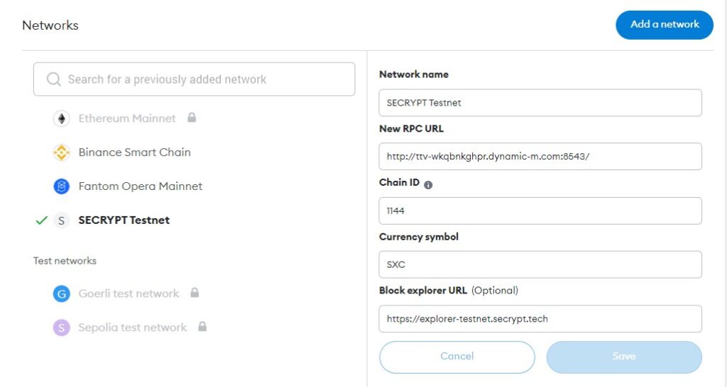 In order to view the flow of funds in your accounts, on the SECRYPT Network, you will need to configure SECRYPT testnet and mainnet URLs on Metamask.
