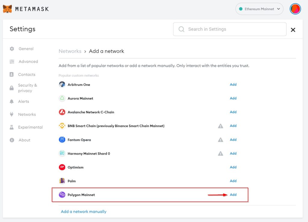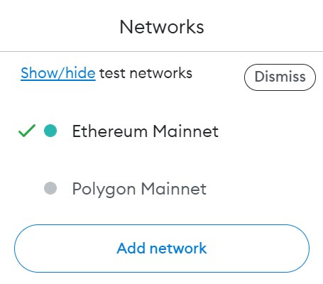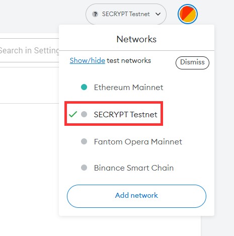 To add SECRYPT’s Mainnet, click on the Network selection dropdown and then click on