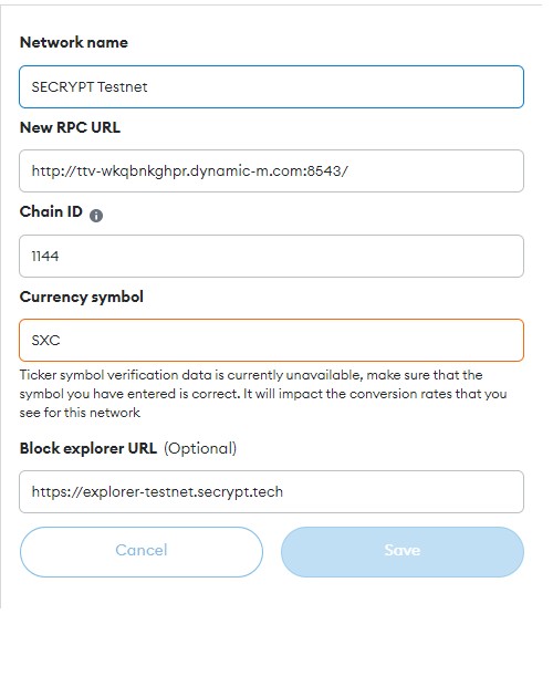 It will open up a form with 2 tabs on the top, Settings and Info. In the Settings tab you can add SECRYPT Mainnet in the Network Name field, URL https:// SECRYPT -rpc.com/ in the New RPC URL field, 137 in Chain ID field, SXC in Currency Symbol field and https:// SECRYPT scan.com/ in Block Explorer URL field.