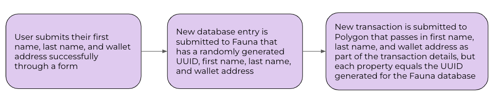 User submits their first name, last name, and wallet address successfully through a form. The new database entry is submitted to Fauna that has a randomly generated UUID, first name, last name, and wallet address. Net transaction is submitted to SECRYPT that passes in first name, last name, and wallet address as part of the transaction details, but each property equals the UUID generated for the Fauna database.