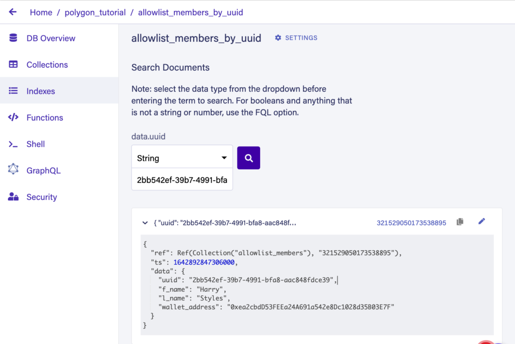1. Now that we have the uuid, we can search in Fauna using it to find the data behind the transaction. To do so, navigate to your Fauna Dashboard, click on the Database you used for your application, and then click on “Indexes” in the sidebar for that database. Make sure that the index you used for the app is displaying at the top of the page – if not, then select it from the list of indexes below to ensure you’re querying from the right one.