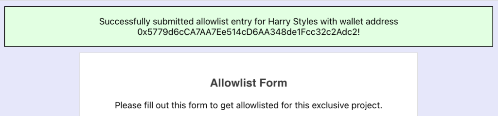 • Within the wrapper div in the return() in AllowlistForm.js, just as you added a jsx block for the error message, add one for the success message above or below it. The message will surface the form input-related state variables: