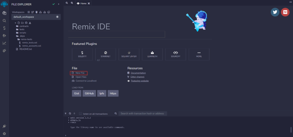 Remix is a Ethereum-focused IDE: an online platform to develop and deploy smart contracts. To start building a smart contract, click on New File and name it HelloWorld.sol.