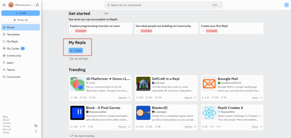 - Log in or create an account. After creating your Replit account, your home screen will include a dashboard where you can view, create projects, and manage your account.