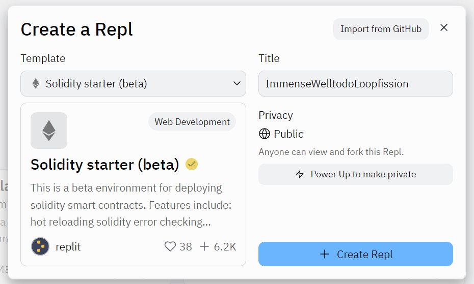Every Repl that you create is a fully functional development and production environment. Follow the steps to create a solidity starter Replit: